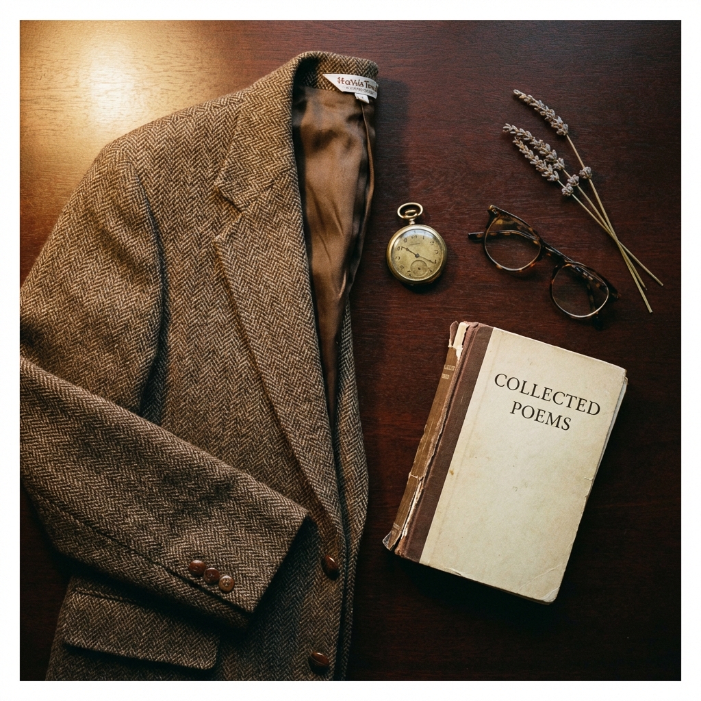 Tweed and tortoiseshell, a pocket watch stopped at the hour he finished the last stanza. Some wardrobes are au…