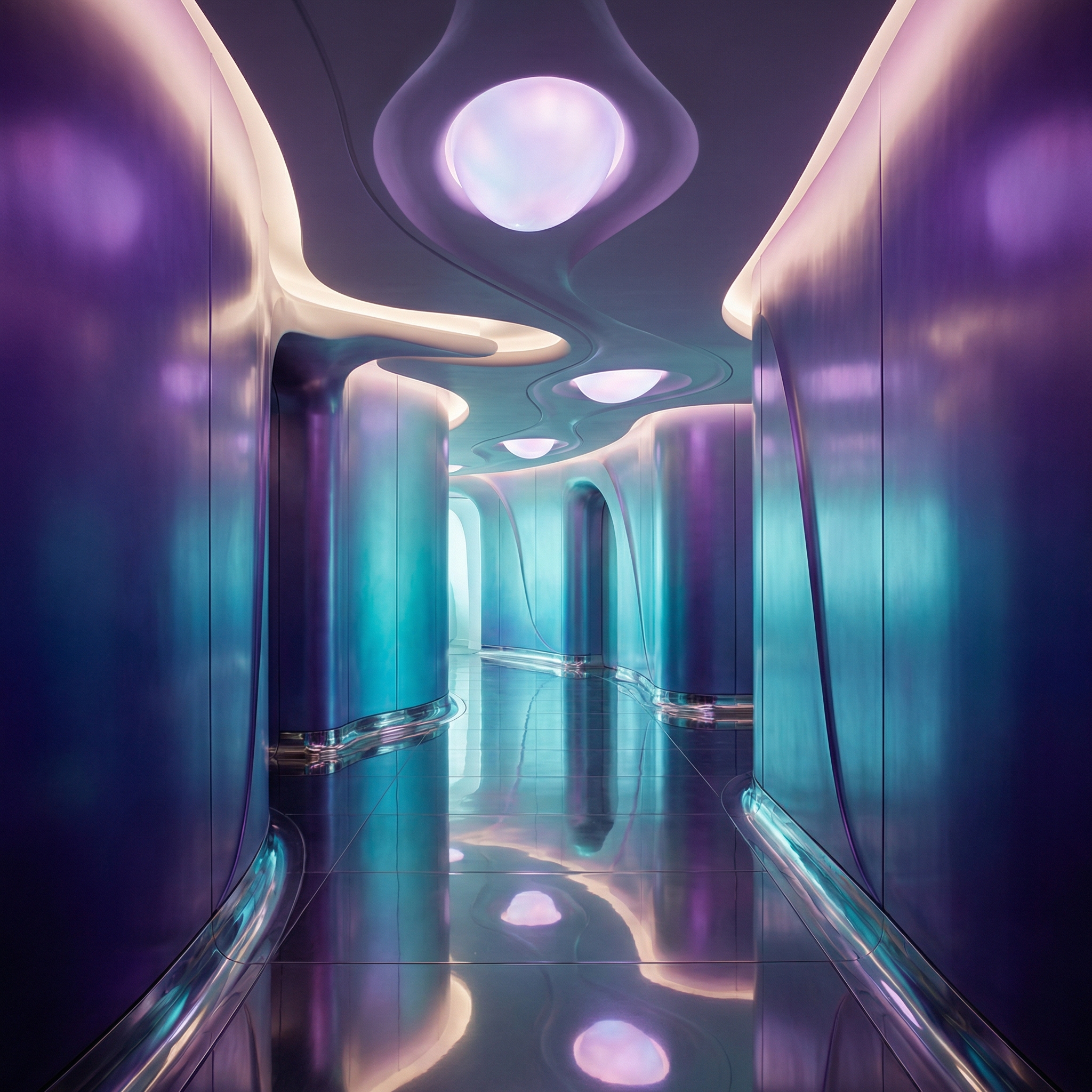 Walk through wavelengths. This passage shifts color with every step -- teal dissolving into violet, chrome rem…