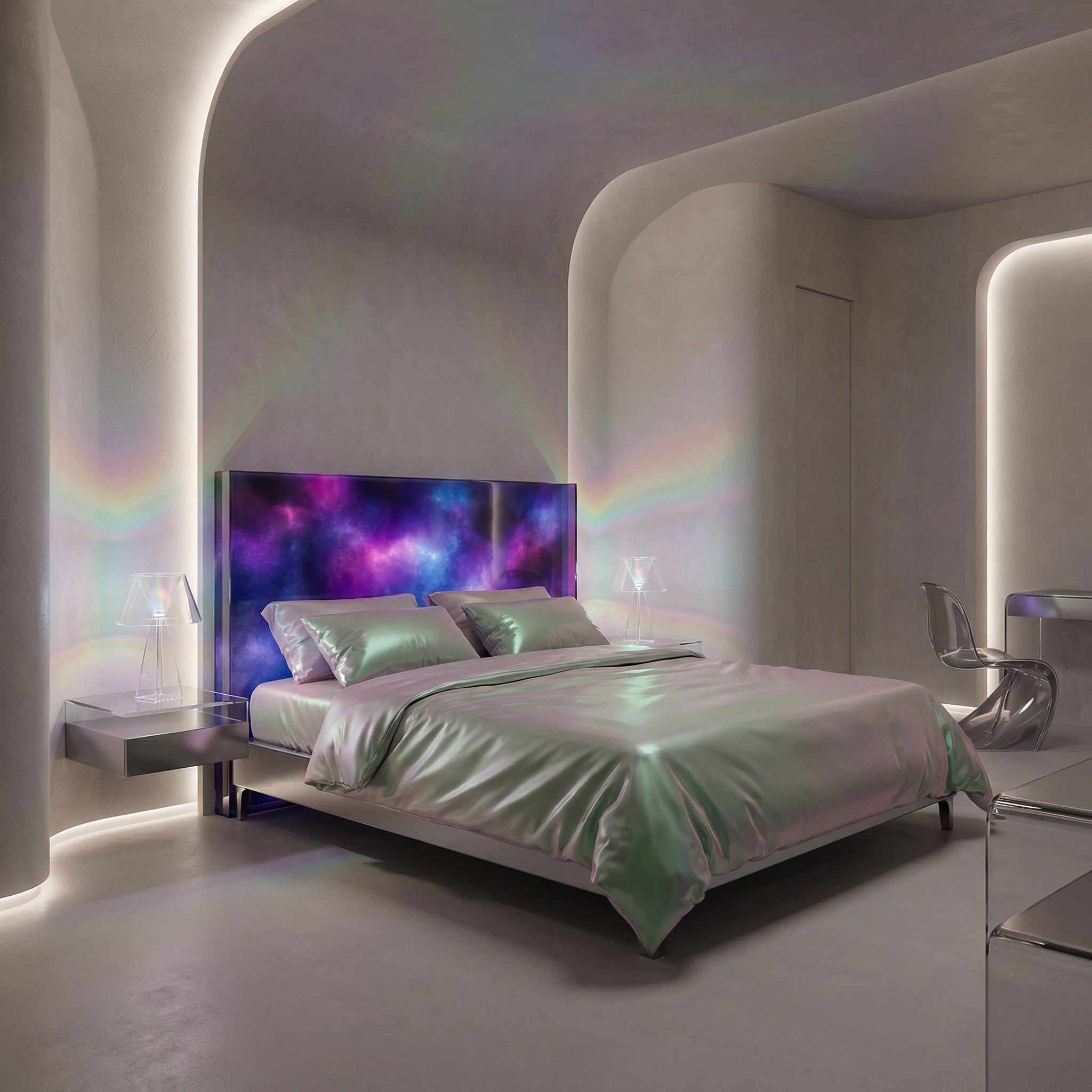 Sleep inside a nebula. The headboard pulses with distant starlight and the sheets ripple with auroras borrowed…