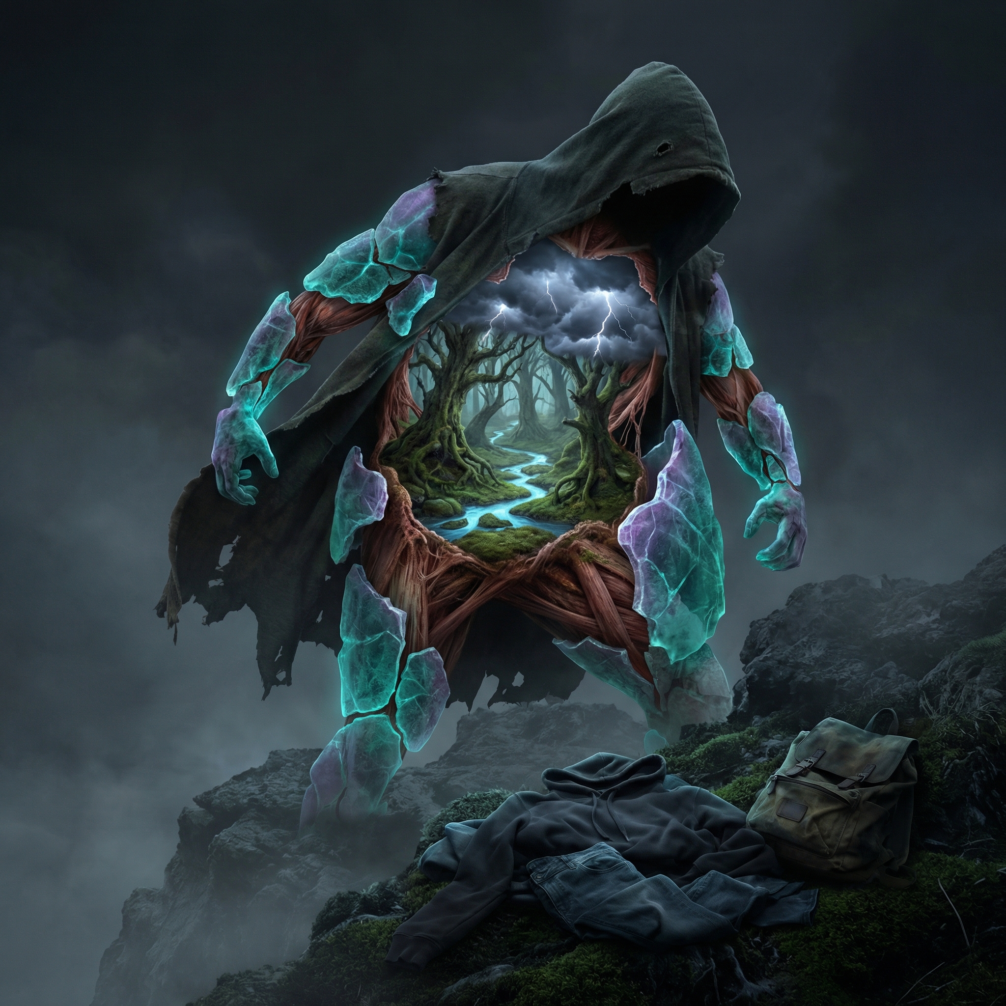A human figure mid-molt, shedding their own reality like a crustacean. Underneath isn't another body — it's an…