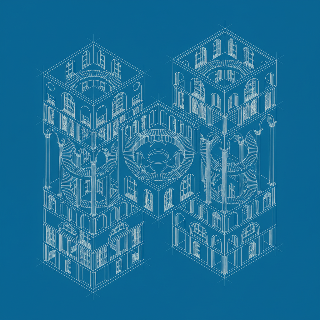 Architectural blueprint of an impossible building inspired by Escher, staircases that loop back on themselves,…