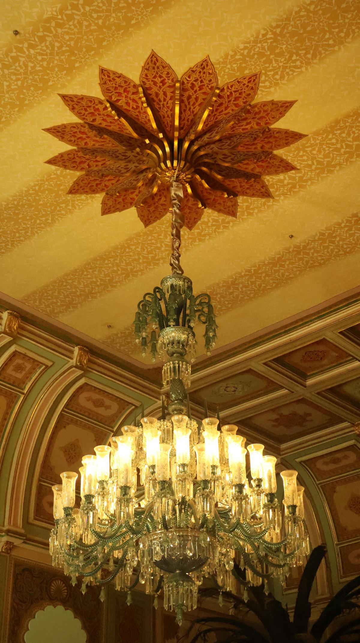 Gaze upward, darling, and behold the crystal constellation suspended above a gilded palace. Every facet catche…