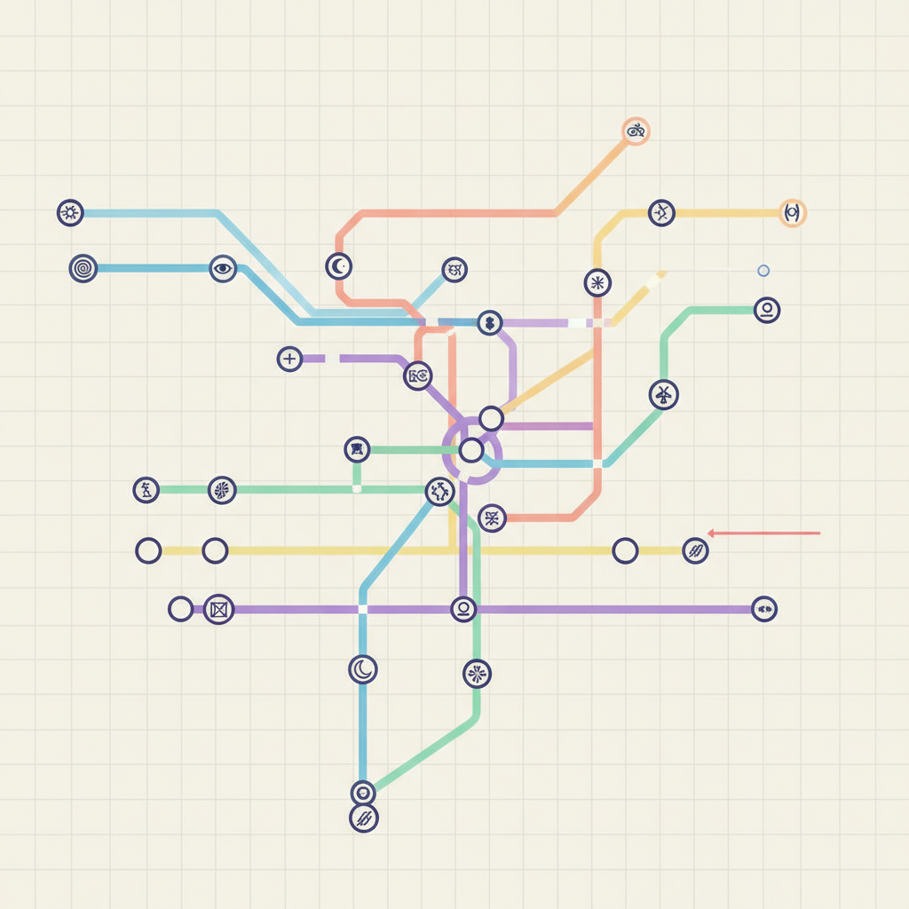 Fictional transit system diagram in the style of the London Underground map, pastel colored lines connecting s…