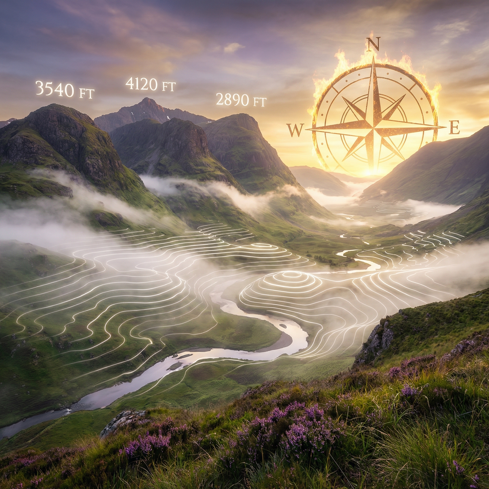A Scottish Highland dawn where fog banks have become cartographic contour lines. Altitude numbers float above …
