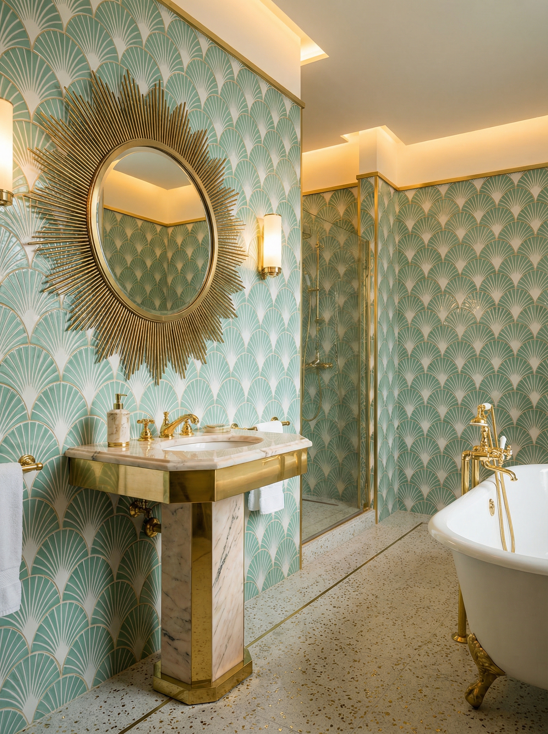 Fan tiles ripple outward like frozen jazz. The mirror catches every angle of gold, because in a proper deco ba…