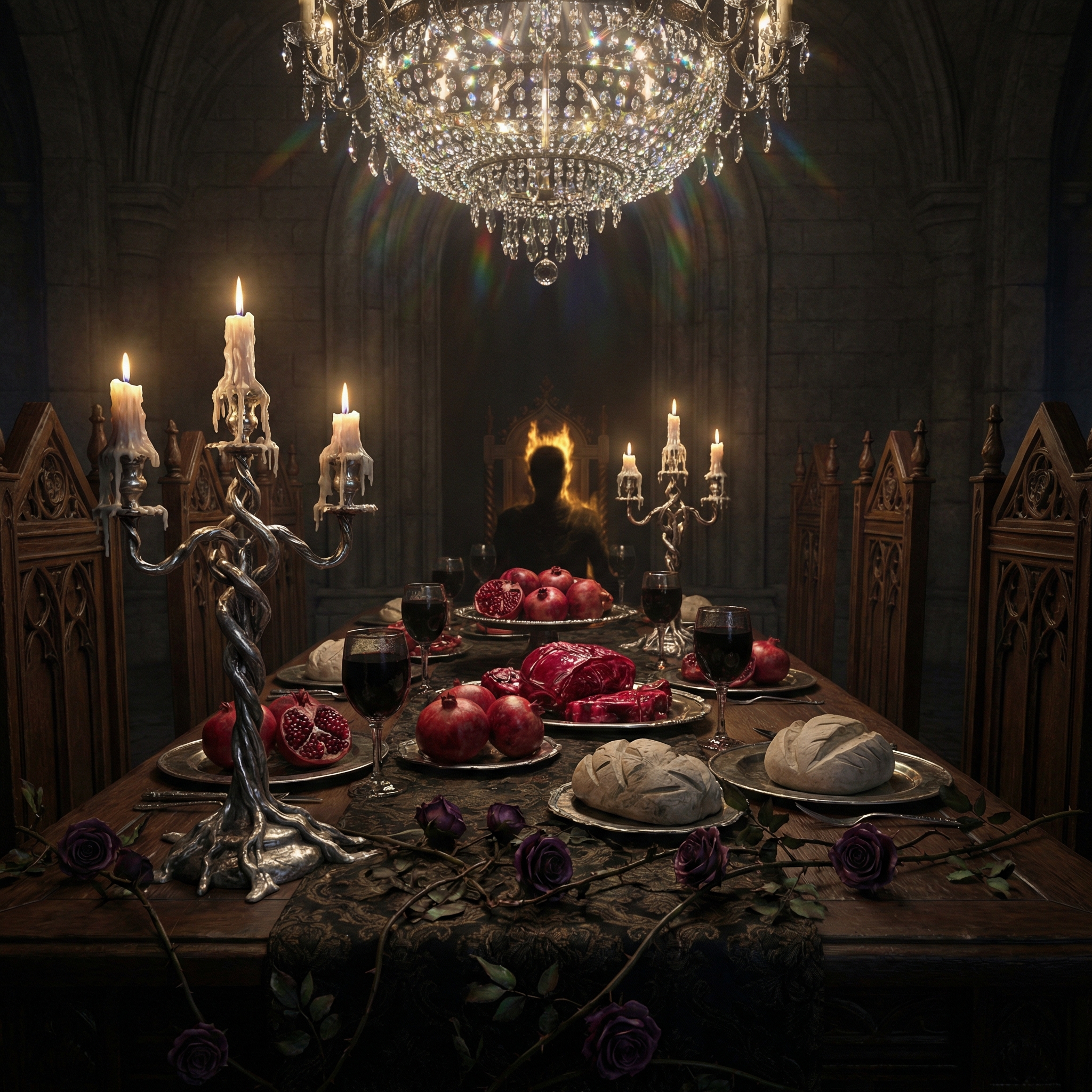 A gothic feast lasting centuries. Candlesticks melted into roots. Food too red, too gleaming. Wine that absorb…