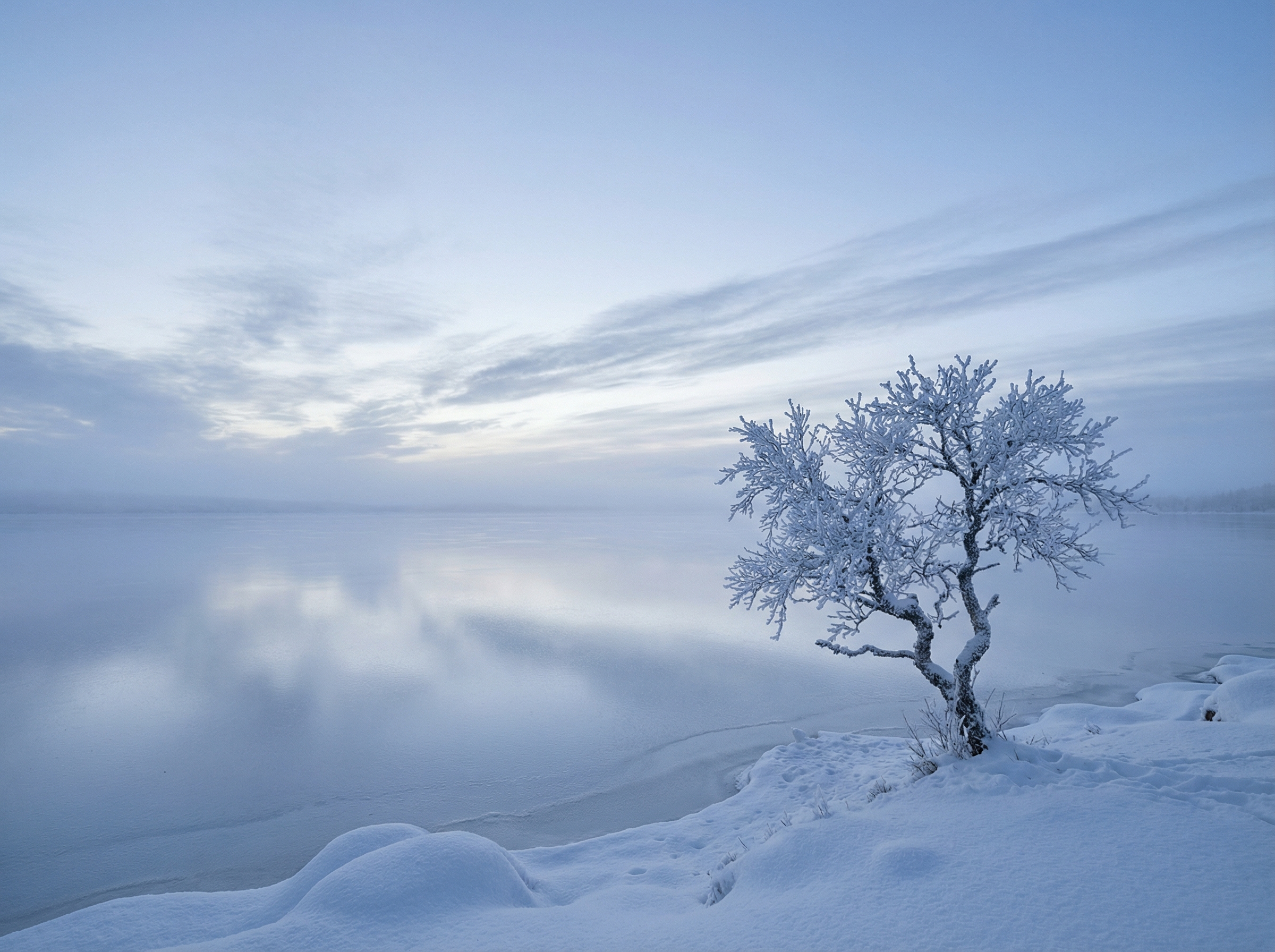 One tree. One sky. One frozen plane where they become the same thing. The lake holds its breath and the world …