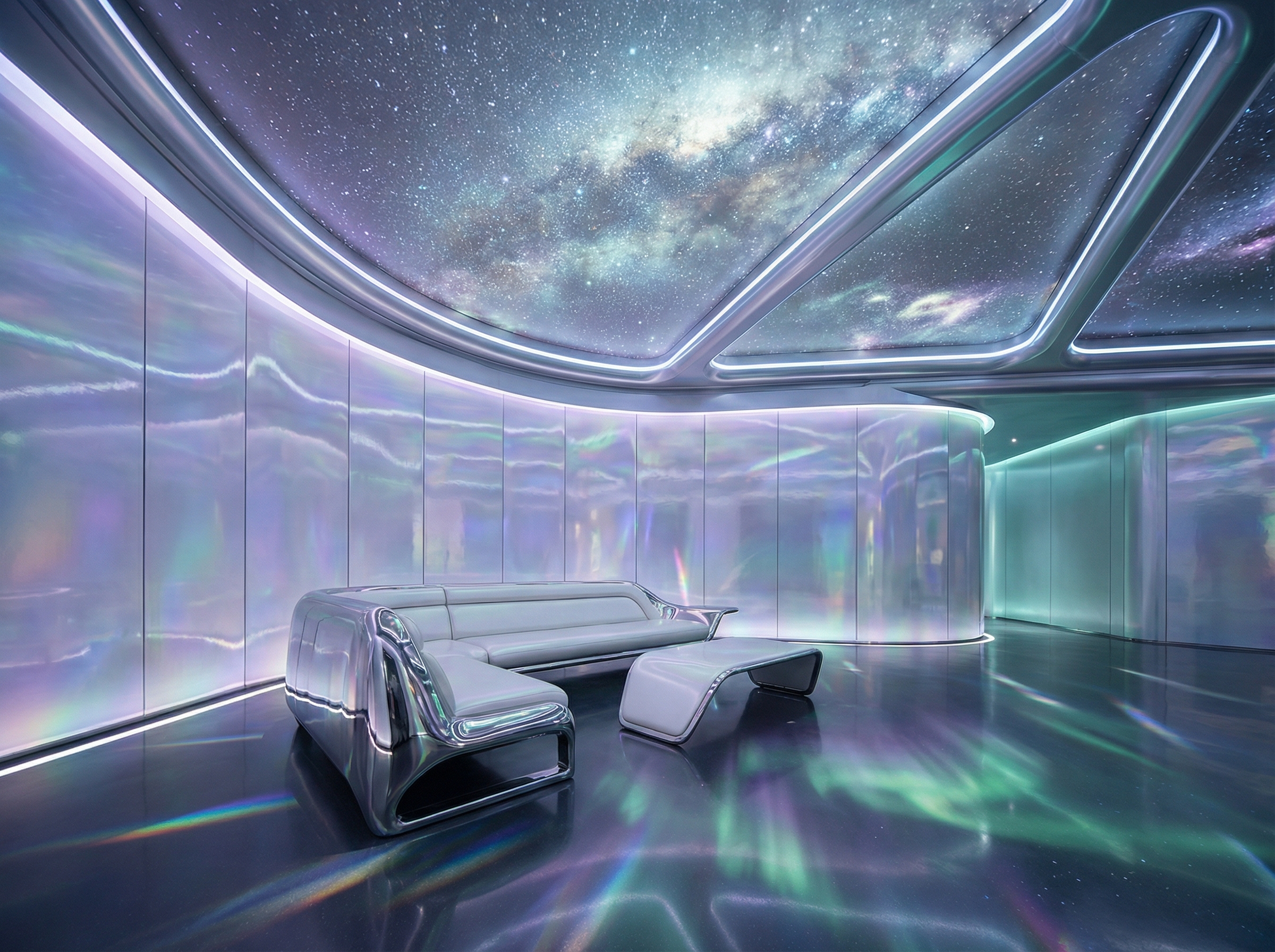 A room where the walls remember starlight — opalescent planes curving into infinity, furniture shaped like tra…