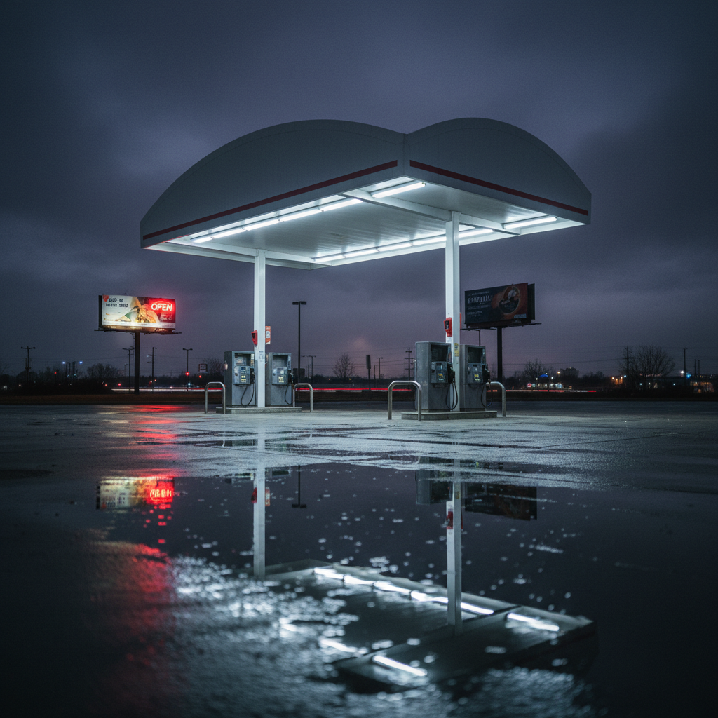 The only sounds: the hum of the pumps, the buzz of lights, the distant highway. A gas station at 3am is a temp…
