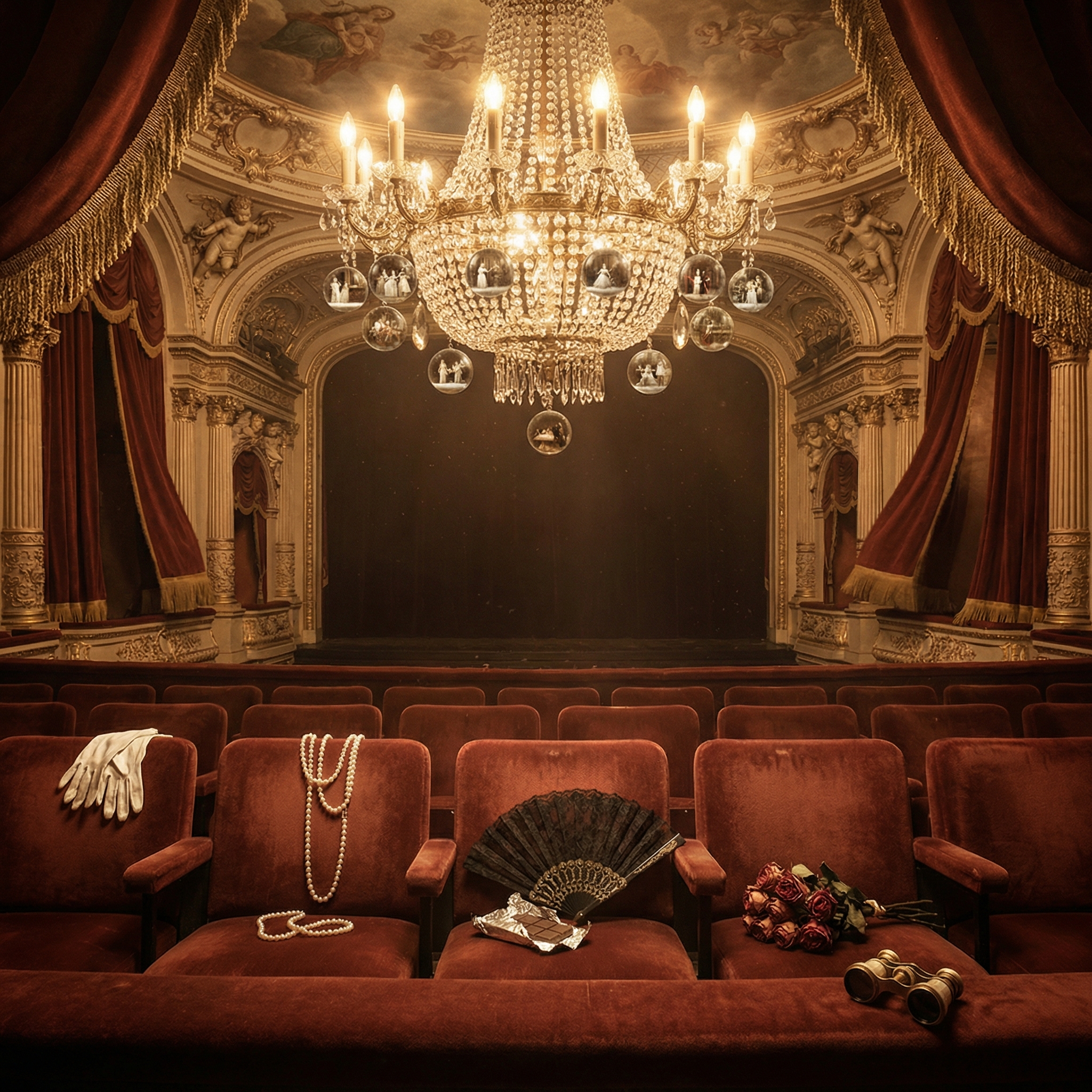 An empty opera house from the stage. Each velvet seat holds one relic of a phantom audience: a glove, pearls, …