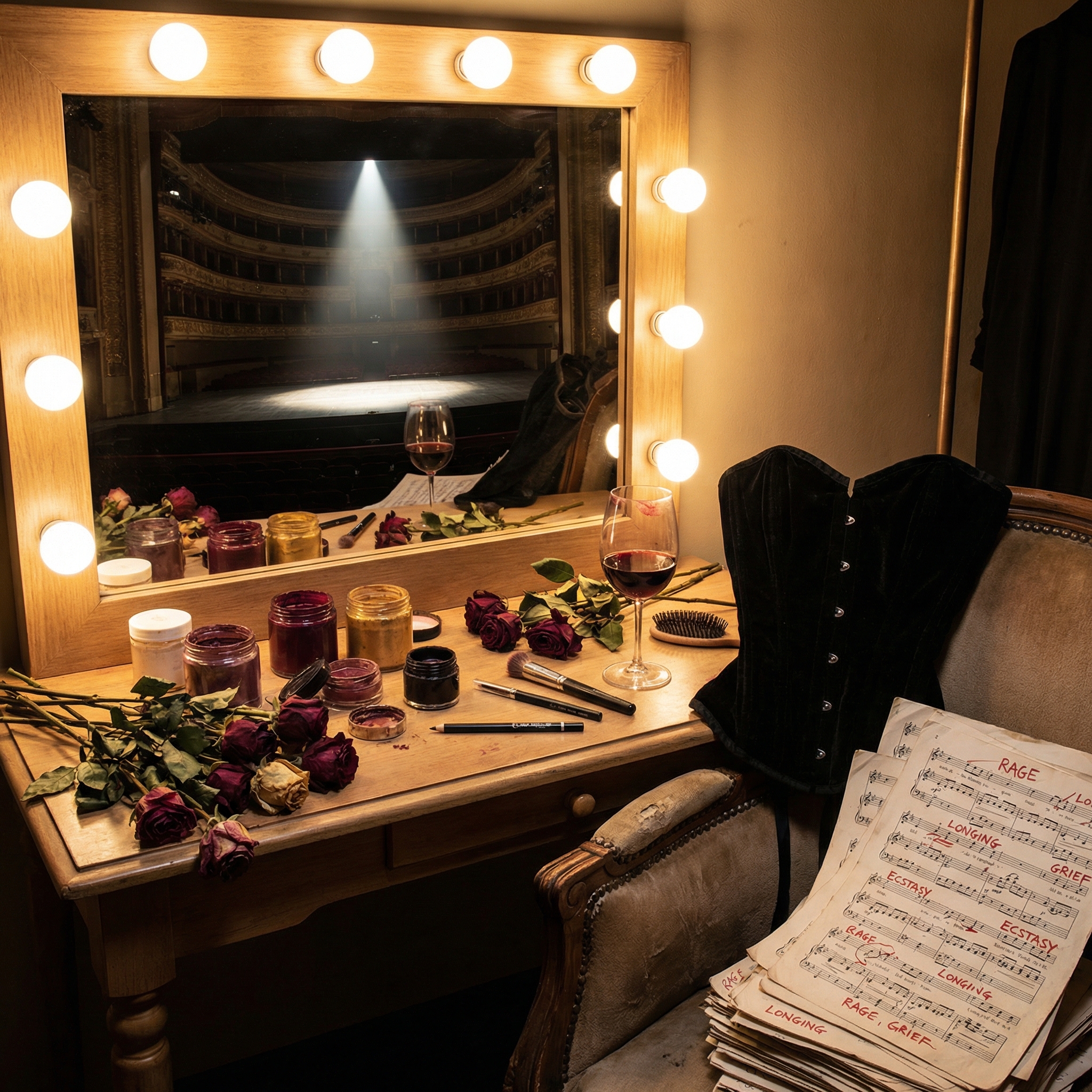 A diva's dressing room. The mirror reflects a vast dark stage. Roses in every stage of decay. Sheet music drow…