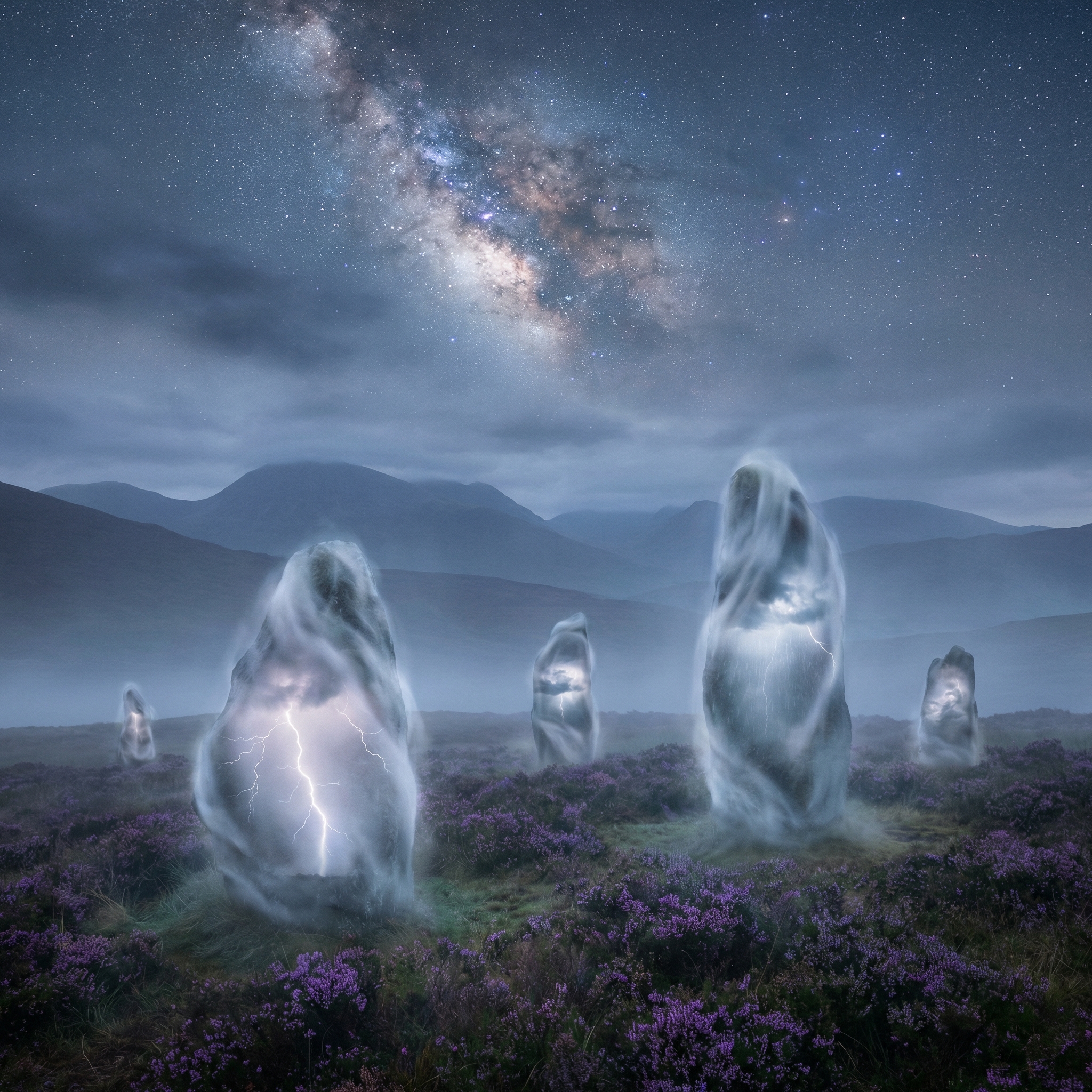 Standing stones made of solidified fog, swirling inside with captured weather, miniature lightning storms. Bio…