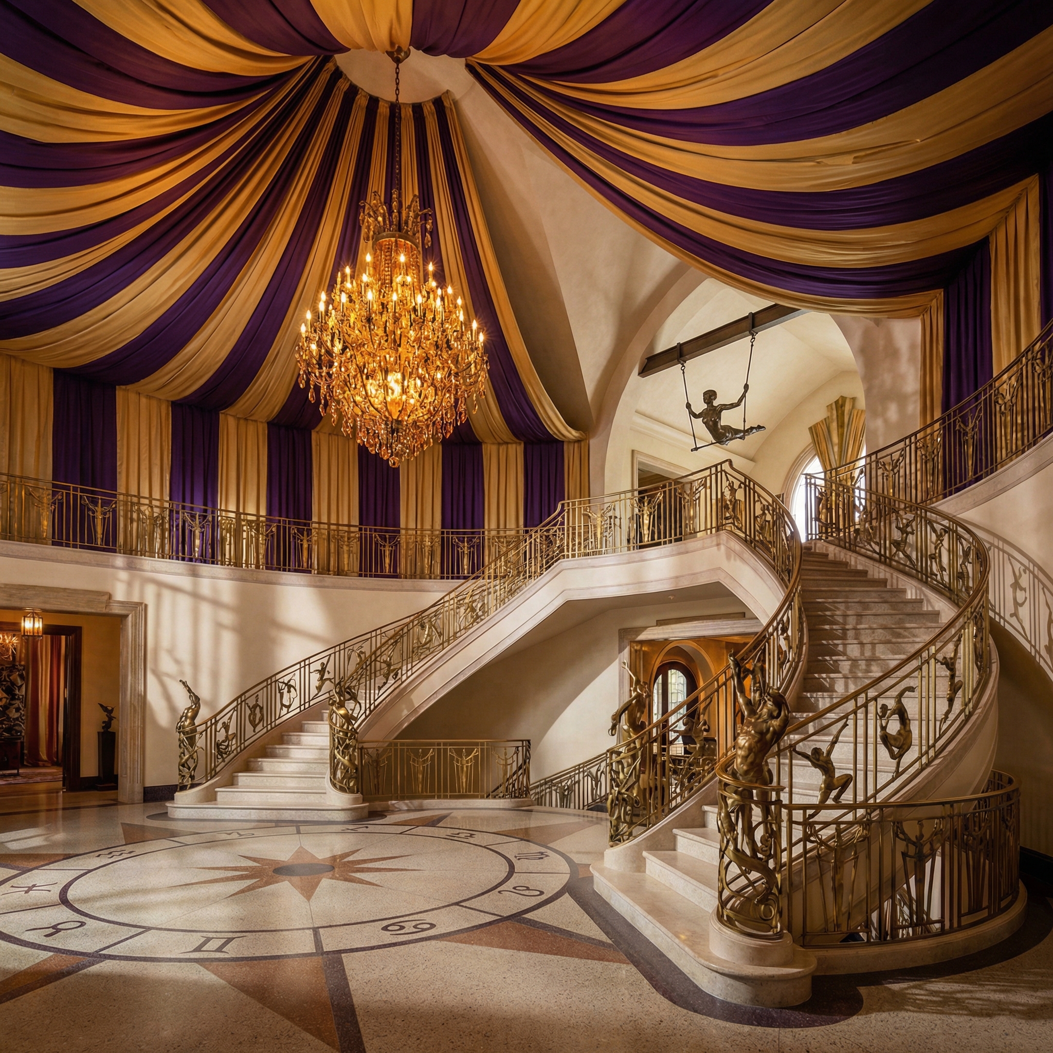 Ladies and gentlemen, feast your eyes on a staircase fit for the ringmaster herself! Purple and gold drapery c…