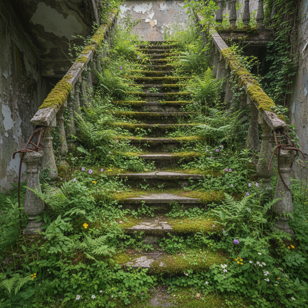 Old weathered concrete staircase with plants growing through every crack and joint, ferns moss and small flowe…