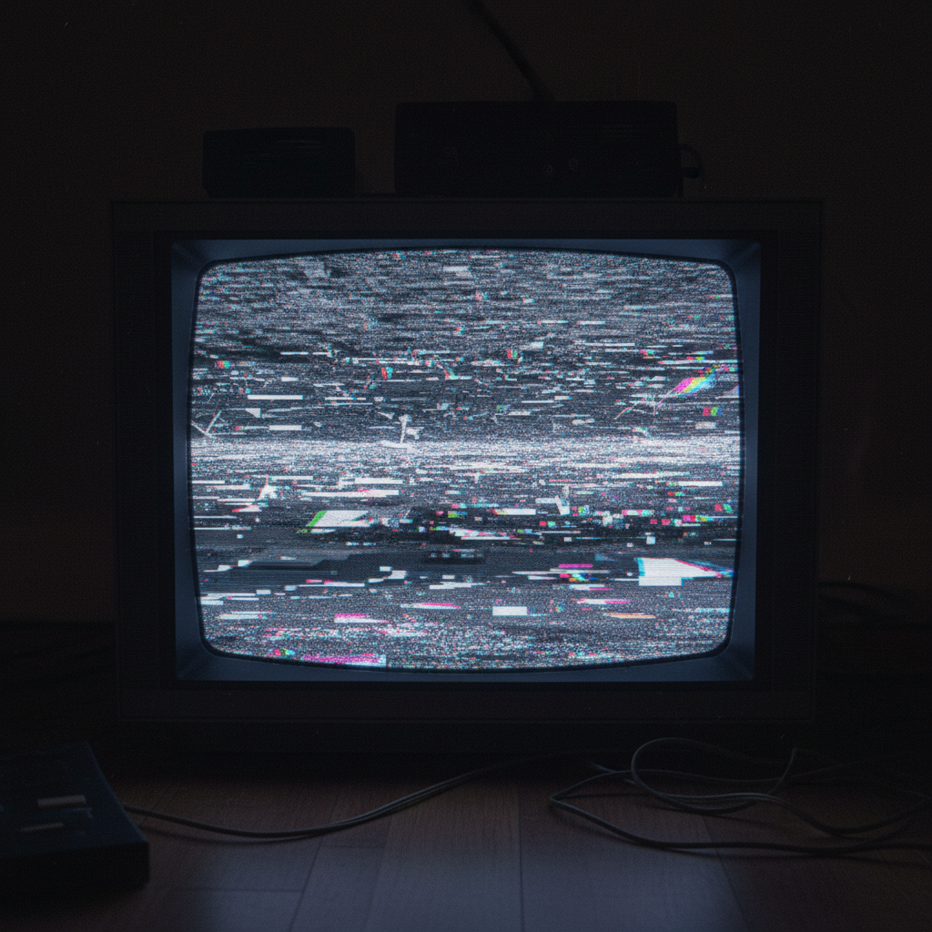 Old CRT television displaying corrupted static with hidden patterns emerging, phosphor glow in dark room, scan…